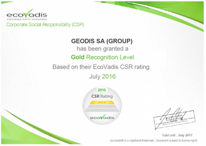 Comme en 2015, Geodis affiche une démarche RSE « Gold » et reste à la première place de sa catégorie sur les 252 entreprises évaluées par EcoVadis, plateforme collaborative effectuant des évaluations de la performance développement durable des fournisseurs pour les chaînes d’approvisionnement mondiales. L'évaluation porte sur 21 critères organisés en quatre thèmes : environnemental, social, éthique des affaires et achats responsables.
